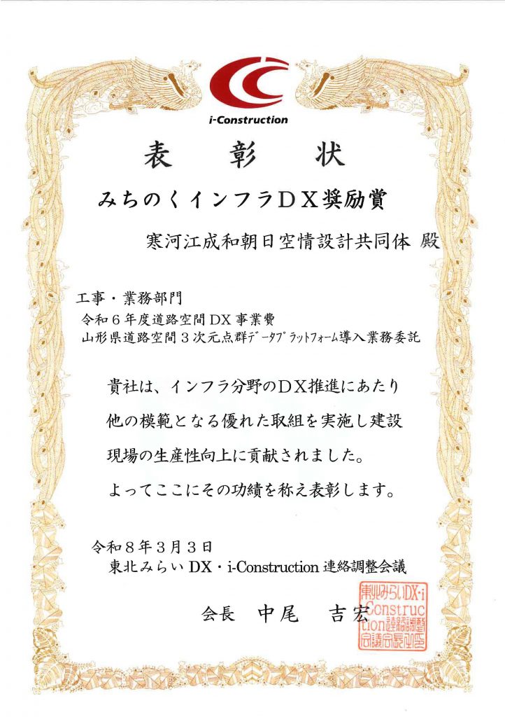 寒河江成和朝日空情設計共同体が実施した「令和6年度 道路空間DX事業費 山形県道路空間3次元点群データプラットフォーム導入業務委託」の取り組みが、同賞を受賞いたしました。