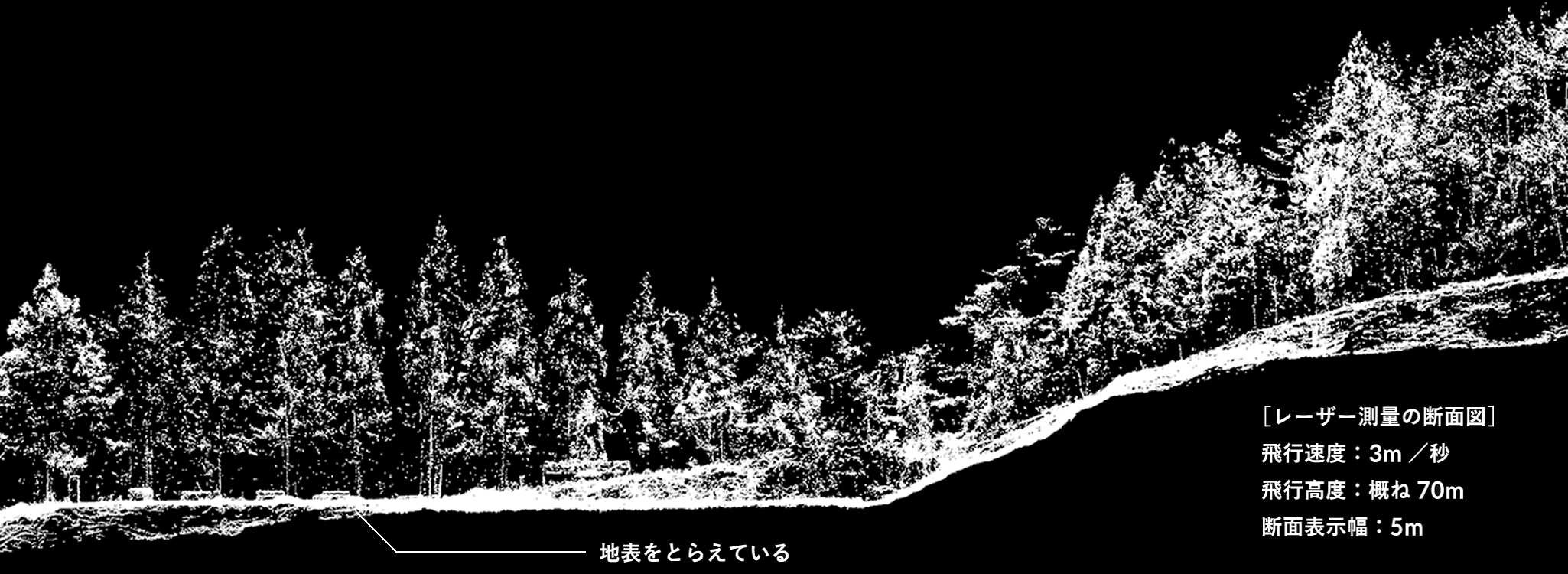 レーザー測量は、植生下の地盤をデータ化できます。写真測量は、撮影された写真から3次元データへ変換します。木々などの植生がある場合、植生の表面しか写真に写らず、写真に写ることのない植生下の地盤は、データ化することができません。